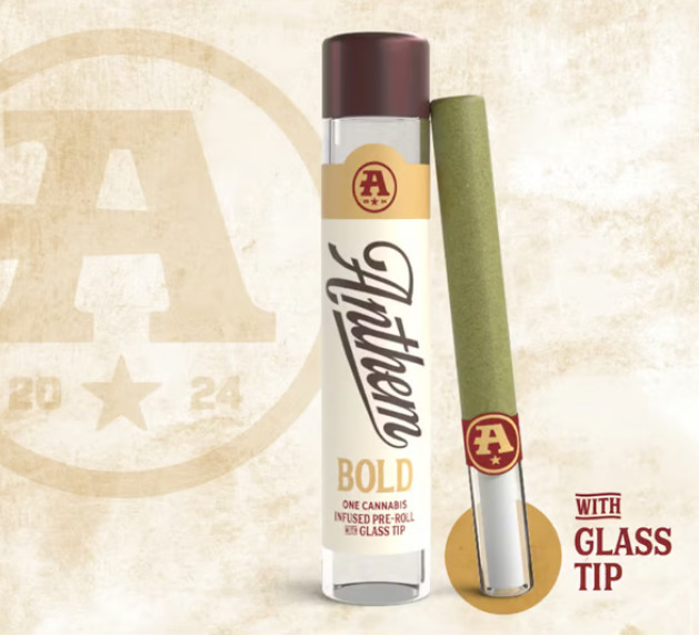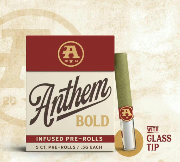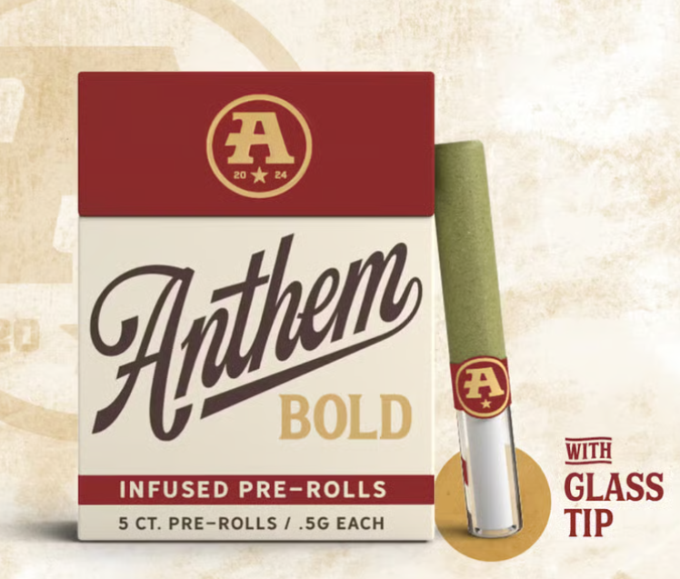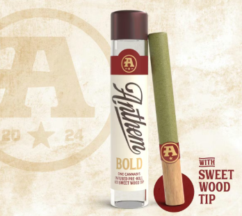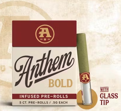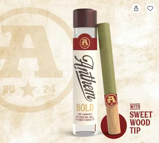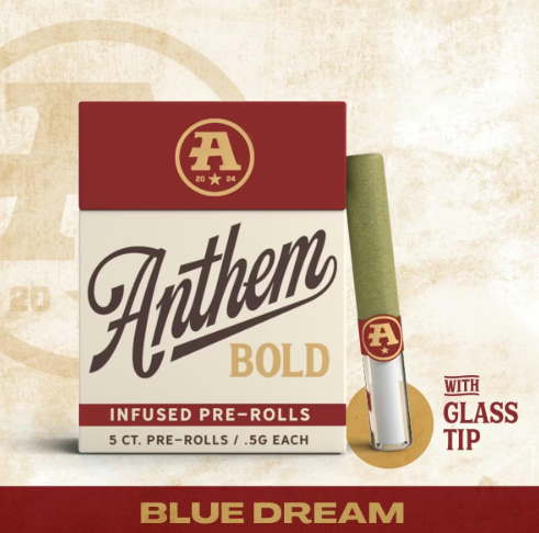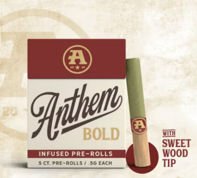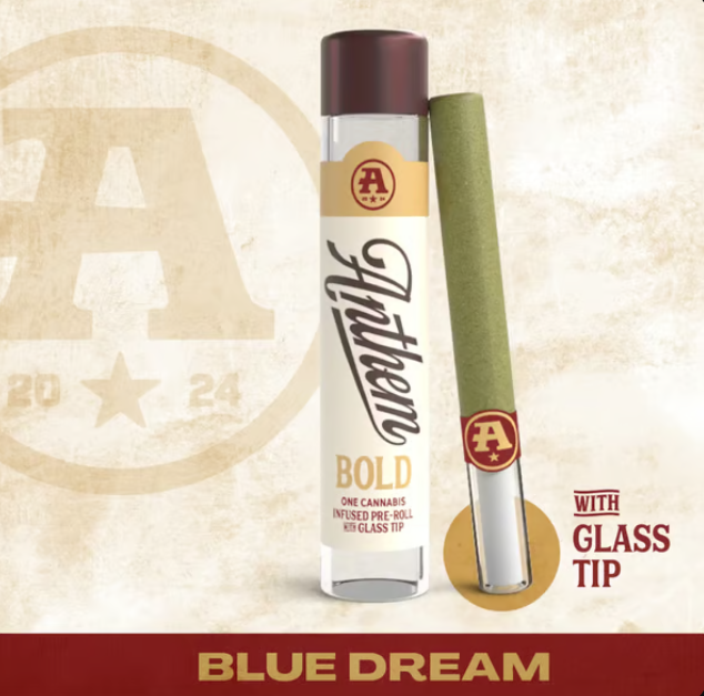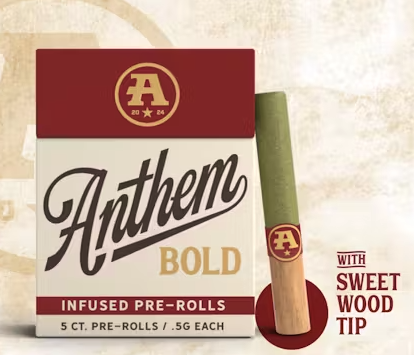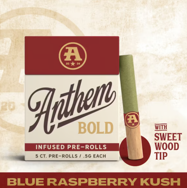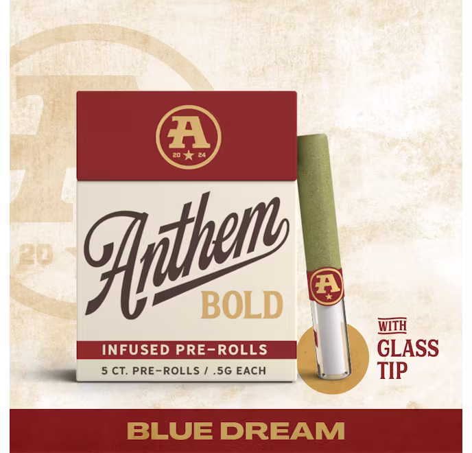 The catalog skews heavily toward pre-rolls. Offerings include 804 pre-rolls and 6 flowers. Anthem has built a broad multi-state presence. Available at 149 dispensaries across 5 states. Pricing lands in the mid-range range for cannabis products. Products run from $16.79 to $50.00. A few products consistently show up across the most locations. Bold Wood Tip Infused Blue Raspberry Kush Pre-Roll 1g (23 stores), Bold Wood Tip Infused Watermelon Z Pre-Roll 1g (22 stores), and Bold Glass Tip Infused Blue Dream Pre-Roll 1g (19 stores).